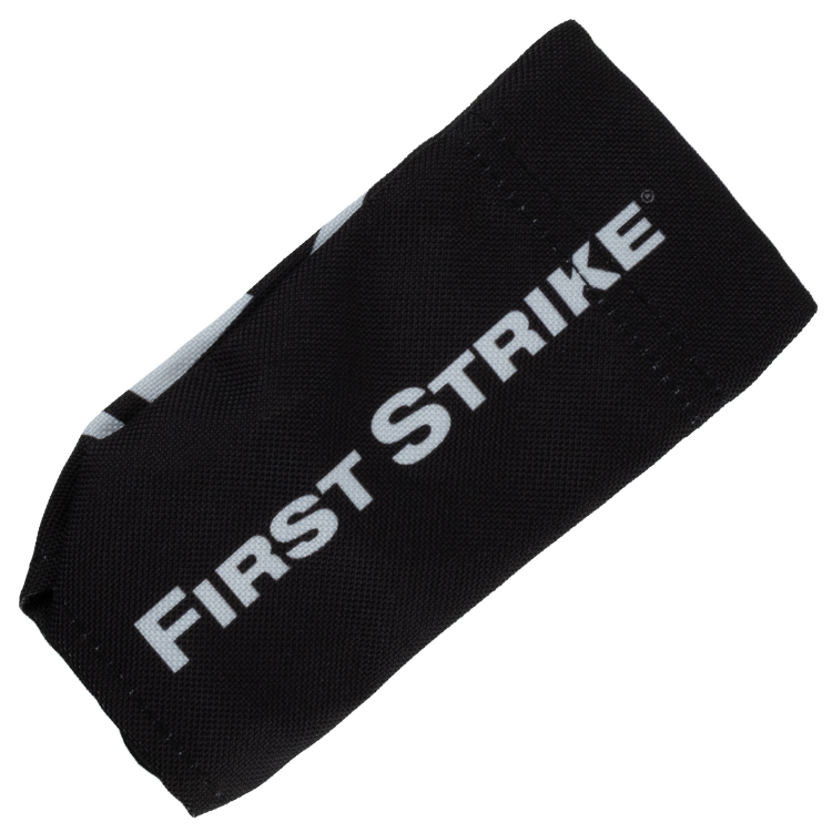Chaussette de course de paintball First Strike avec lettrage du logo sur un côté et logo First Strike sur l'autre côté.