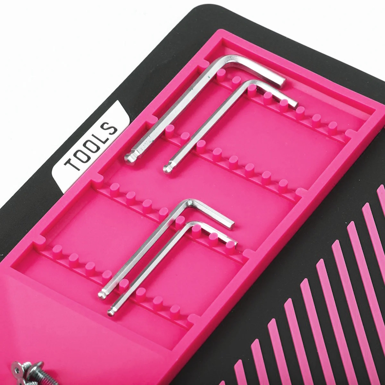 Le plateau à outils rainuré, le plateau magnétique pour les pièces et le rebord surélevé empêchent les petites pièces comme les vis, les ressorts ou les billes de rouler et de tomber de la surface de travail. Le logo en relief maintient fermement votre marqueur sans le rayer, assurant ainsi un espace de travail stable et sûr.