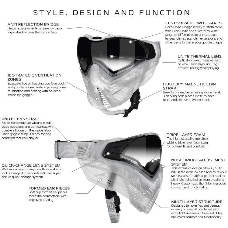 Le nouveau masque de paintball push a été développé en coopération avec d'anciens joueurs professionnels des États-Unis et des concepteurs de produits de paintball expérimentés qui ont déjà travaillé avec de nombreuses entreprises bien connues dans l'industrie. Le résultat est un masque intéressant qui peut jouer au top en termes de qualité. Seuls les meilleurs matériaux ont été traités.